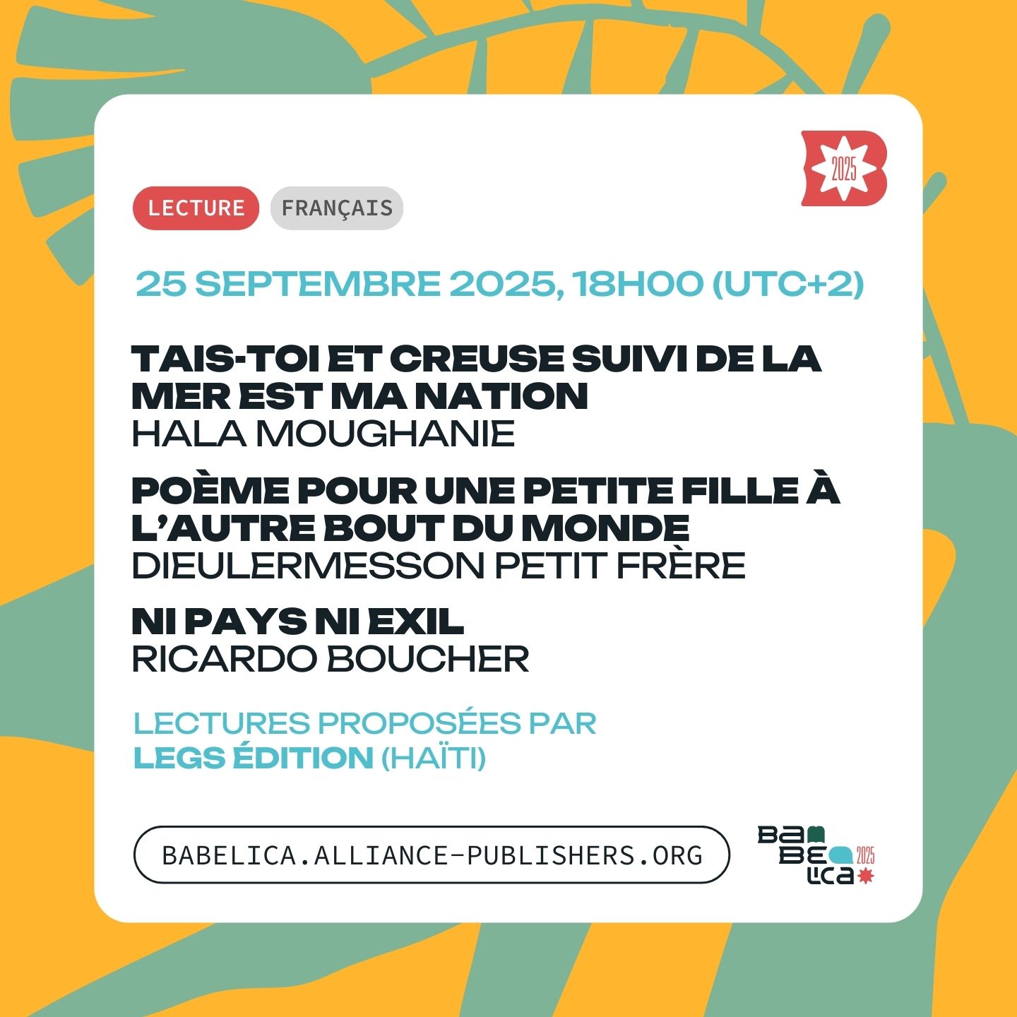 Cette année, LEGS ÉDITION propose au public trois séances de lectures poétiques le 25 septembre à 18h (heure de Paris) et 12h (heure d’Haïti, de New York et Montréal). Les séances sont constituées de lectures vidéo d’extraits de poèmes tirés de recueils parus des collections Poésie et Paroles.